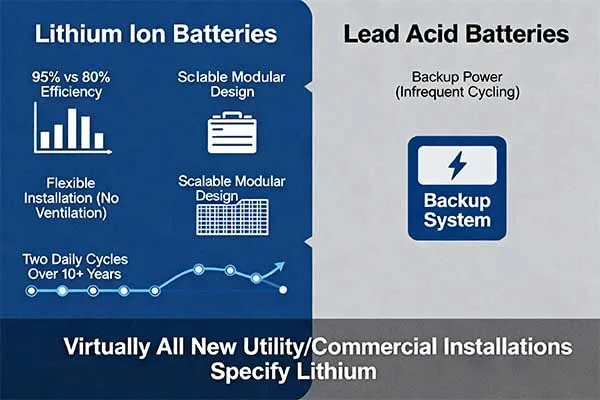 While lead acid remains viable for backup power applications with infrequent cycling, virtually all new utility and commercial installations specify lithium technology.