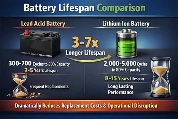 This 3-7 times longer lithium ion vs lead acid battery lifespan dramatically reduces replacement costs and operational disruption.