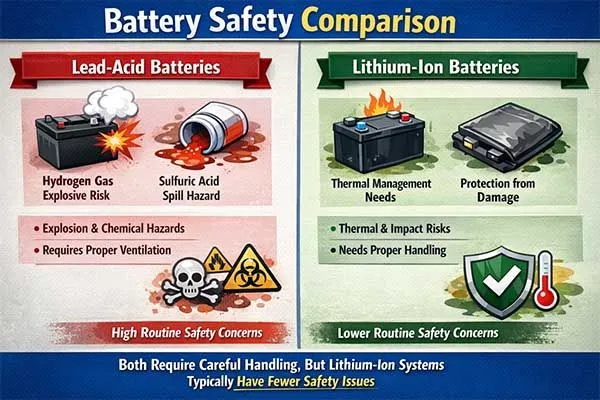 Lead acid presents continuous chemical and gas exposure risks during normal operation, while lithium systems operate safely under normal conditions but require proper protection against abuse conditions.