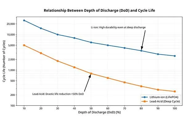 The lead acid battery vs lithium ion comparison shows lithium maintaining 3,000+ cycles even at 80% DoD, with minimal penalty for deep discharge operation.