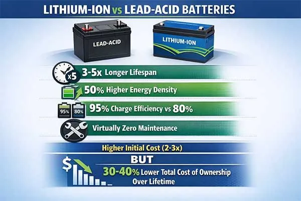 Lithium-ion batteries offer superior long-term value over lead-acid for most industrial, commercial, and energy storage applications due to longer lifespan, higher efficiency, zero maintenance, and greater flexibility.