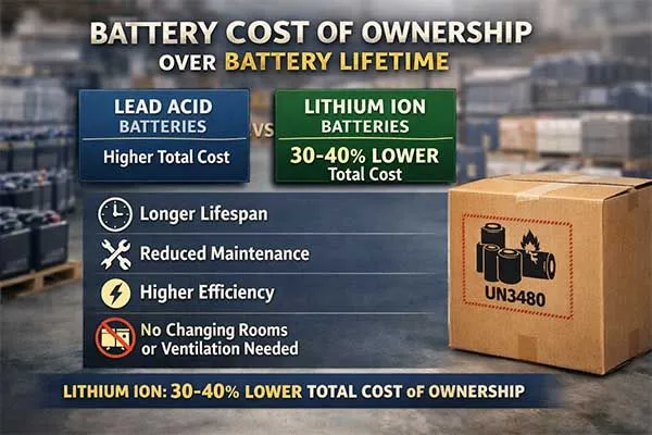 However, lithium ion vs lead acid battery cost comparison over the battery lifetime shows lithium achieving 30-40% lower total cost of ownership due to longer lifespan, reduced maintenance, higher efficiency, and eliminated infrastructure requirements like battery changing rooms and ventilation systems.