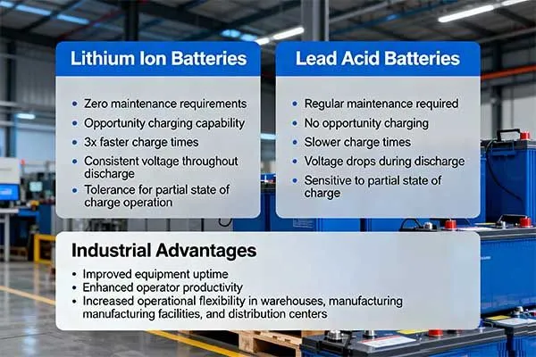 When comparing lead acid vs lithium batteries, lithium ion technology offers 3-5 times longer lifespan, 50% higher energy density, 95% charge efficiency versus 80% for lead acid, and requires virtually zero maintenance.