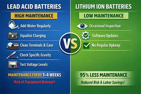 The lithium ion battery vs lead acid maintenance comparison couldn’t be more different.